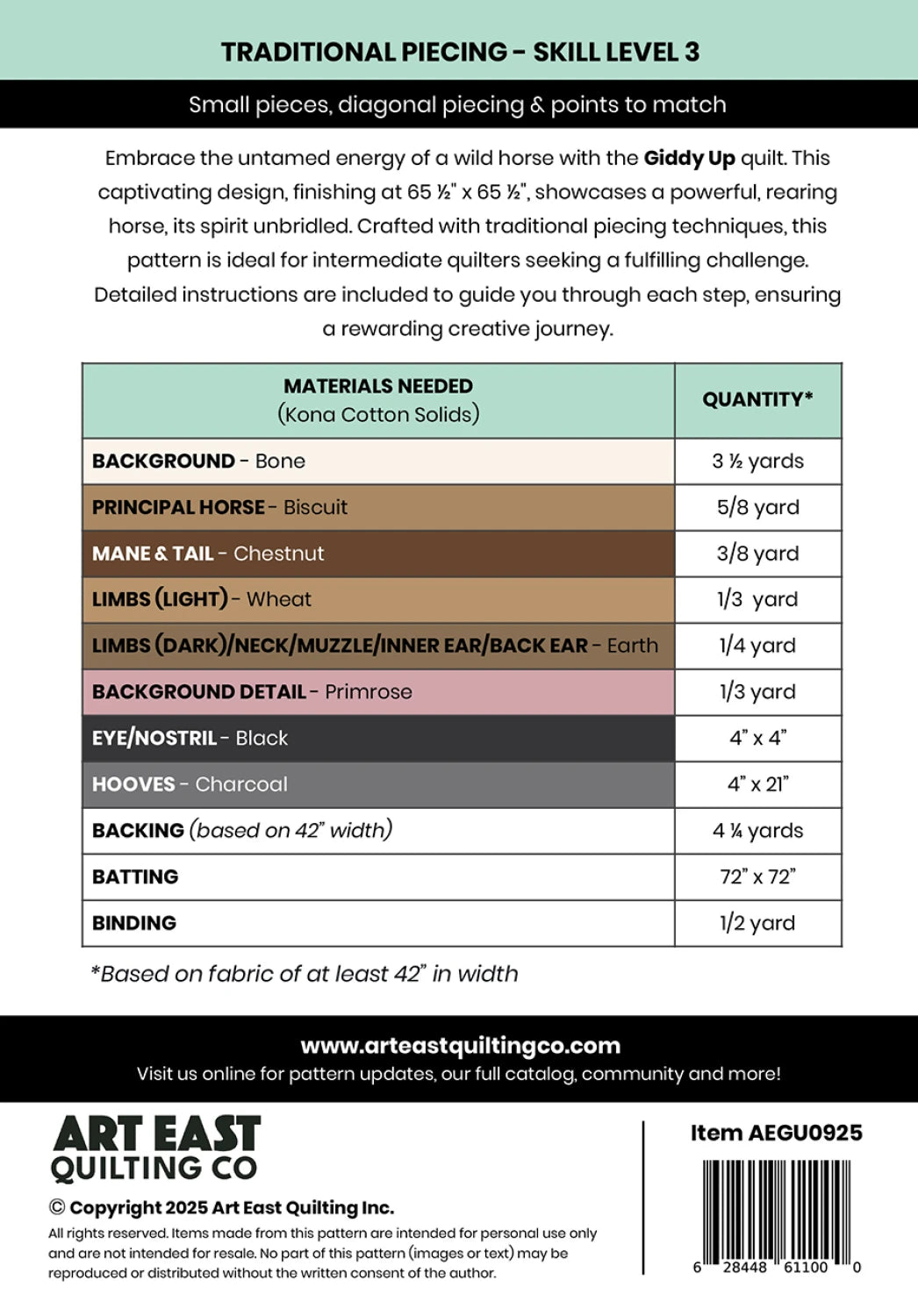 Embrace the untamed energy of a wild horse with the Giddy Up Quilt. This captivating design, finishing at 65 ½" x 65 ½", showcases a powerful, rearing horse, its spirit unbridled. Crafted with traditional piecing techniques, this pattern is ideal for intermediate quilters seeking a fulfilling challenge. Detailed instructions are included to guide you through each step, ensuring a rewarding creative journey.